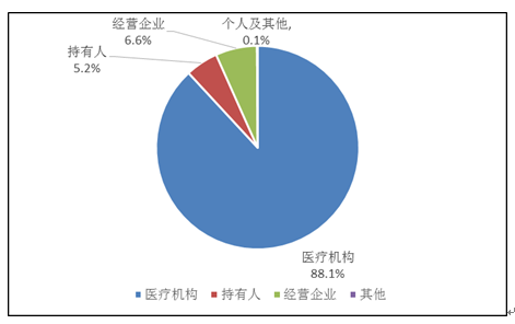 持有人、經(jīng)營企業(yè)和醫(yī)療機(jī)構(gòu)是藥品不良反應(yīng)報(bào)告的責(zé)任單位。按照報(bào)告來源統(tǒng)計(jì),2019年來自醫(yī)療機(jī)構(gòu)的報(bào)告占88.1%;來自經(jīng)營企業(yè)的報(bào)告占6.6%;來自持有人的報(bào)告占5.2%;來自個人及其他報(bào)告者的報(bào)告占0.1%(圖3)。