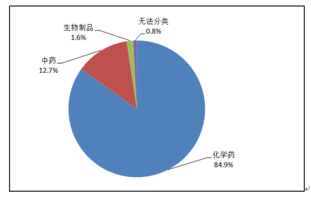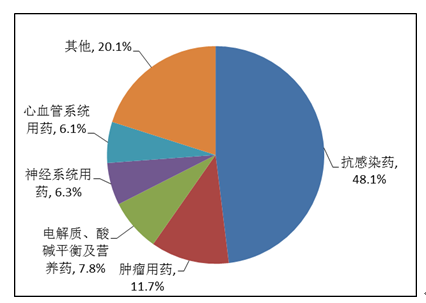 按照藥品類別統(tǒng)計(jì),化學(xué)藥品占86.6%,中藥占12.6%,生物制品占0.8%?;瘜W(xué)藥品排名居前的藥品類別是抗感染藥、心血管系統(tǒng)用藥、腫瘤用藥、神經(jīng)系統(tǒng)用藥、電解質(zhì)、酸堿平衡及營養(yǎng)藥;中藥排名居前的藥品類別是理血劑、補(bǔ)益劑、祛濕劑、開竅劑、清熱劑。
